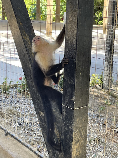 Finally our guide led us to the Capuchin monkey cage. We had to leave EVERYTHING in a licker just outside the monkey cage so they wouldn’t take things from pockets etc . Then we entered the cafe with another group. The 2 groups formed separate semicircles and the monkeys came down to investigate us. Done were enticed down with treats but once 1 monkey was checking us out the others cane to see what was happening.