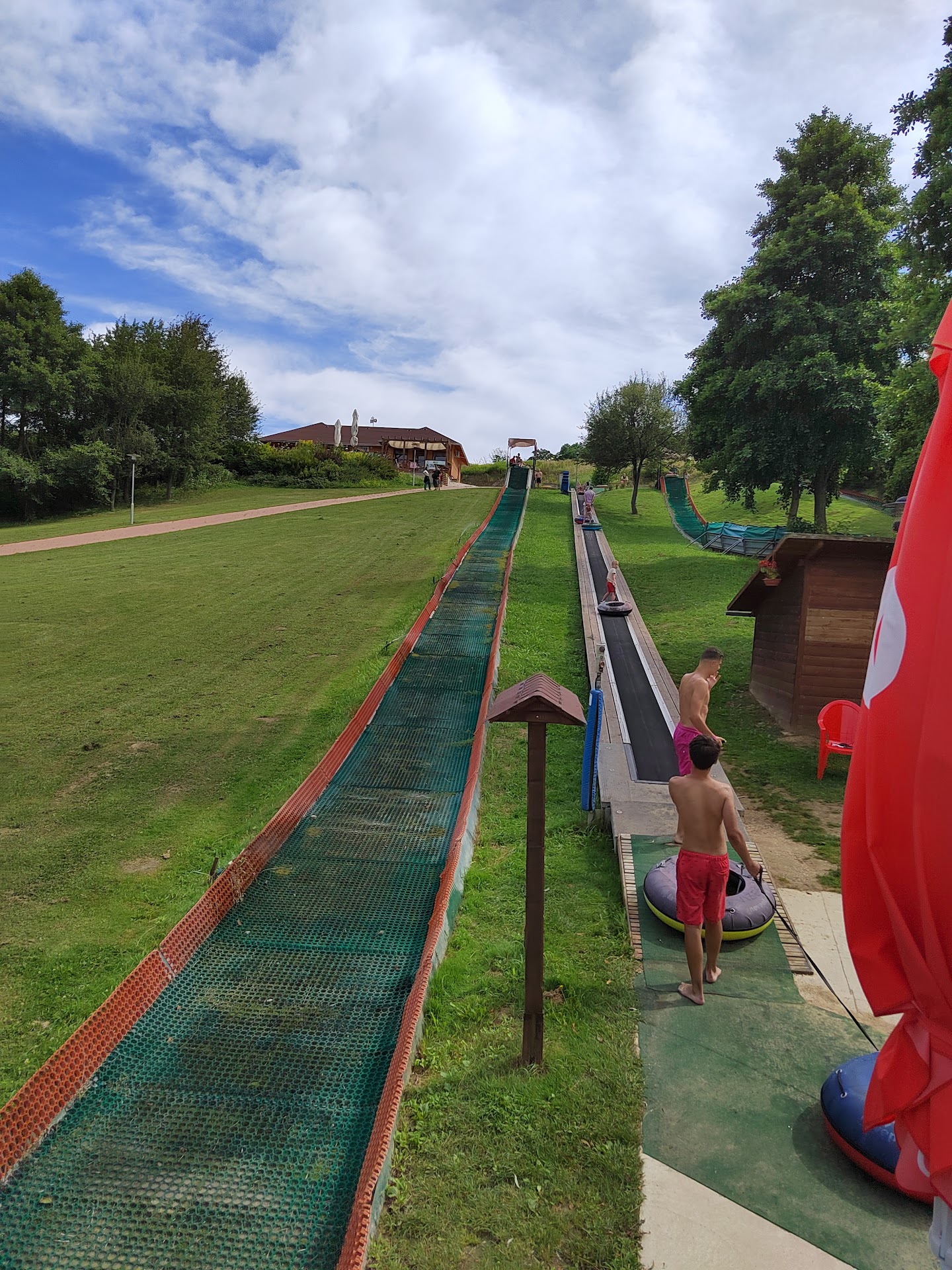 Read moreAz első kellemetlen érzés akkor ért, mikor 2 felnőtt és két gyerek (3 és 7 éves) belépéséért 28 ezer forint kifizetése után közölték, h vannak játékok, amelyekre még körönként 1000 forintot kell fizetni... Természetesen pontosan azok a játékok, amelyek érdeklik a gyerekeket. A 28ezer is nagyon sok, de a plusz 1000 KÖRÖNKÉNT felháborító! Az interneten azt írják 4000 Ft-tól, de mint kiderült az csak SÉTÁLÓJEGY, ha fel akarok ülni bármire (vagy muszáj mert kicsi a gyerek és egyedül nem szállhat fel sok játékra pl.: bob, hullámvasút, vízibicikli) akkor kénytelen vagyok a drágább, 7000 forintos jegyet venni. A játékok nagyon koszosak, talán sosem tisztítják őket. A hófánkok feketék (a kosztól) , a bob sem volt épp tiszta (és senki más nem ült rajta, a kezelő meg egy székben pihent, gondolom lett volna ideje letörölni), és egy fémcsúszda konkrétan el volt tömődve a sok ráhullott levéltől, ágtól stb, szóval azt már jó régen le sem söpörték. A parkban nem ártana gyakrabban nyírni a füvet, helyenként térdig ért a gaz. A legtöbb játékot csak kezelő felügyelete mellett szabad használni (aminek egyébként van értelme), csakhogy nem áll mindegyik mellett egy ember, így néha úgy kell vadászni vkit, h ugyan jöjjön már (airbike/kötélpálya). A pénztárnál tájékoztattak bennünket, h a nagy kötélpályán vmi korlátozásuk van (gondolom karbantartás), ezt ellensúlyozandó kaptunk 4 ingyen jegyet a bob-ra. Azt már nem mondták és kárpótolni sem akartak érte, h nem volt vízidodzsem sem, gokart sem, a légpuska nem működött (bár volt) az étterem és a pizzéria illetve a palacsintázó zárva volt, annak ellenére, h több helyen is óriási tábla hirdeti a 40 cm-es palacsintát. Arra jó volt, h a 2 gyerek hazáig azon szomorkodjon, h nem ehetett óriáspalacsintát... Kb 2 óra alatt végigjártuk az egészet, szóval egész napos programnak tervezni csak nehezen lehet, így meg finoman szólva drága. Azért volt, ami európai szintű volt: Minden dolgozó nagyon kedves volt (már ahol találtunk vkit), a mellékhelyiség tiszta volt, és viszonylag sokféle játék van, de kevésbé ajánlom kisgyerekes családoknak, nekik nincs sokminden. A parkoló nagy és szép, rendezett, burkolt, nem a porban kell megállni. A hölgy a pénztárban kedves és türelmes volt, van térkép a parkhoz és rögtön kaptunk egy csomó információt is.