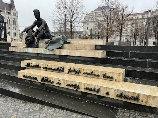 An open museum and the new location of the monument is sitting on the steps of the embankment front of Danube River with the lines placed on the statue that translate (In English) "As if my own heart had opened its gate:The Danube was turbulent, wise and great." Between Parliament Building and Shoes on...