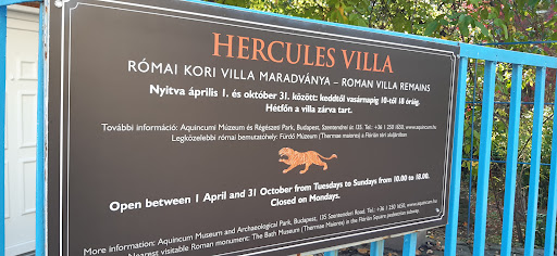 What a pleasure has been visiting the ruins of this Roman villa! Although I did not get any explanation, the site was open (as it was supposed to be, every Sunday between 11 am and 1 pm) and a lady greeted me at the entrance. Entrance is free and you get to see three mosaics (the one depicting Hercules has been placed at the near Aquincum museum), together with the structure of the villa and some stone sarcophagi, since the site was at a later stage used as a burial place. There's a sheet explaining the history of the villa in Hungarian and in English, there are benches, a bin and a drinking fountain. The site is in a residential area, easily reachable by public transport (I got the tram number 1 and walked less than 10 minutes to it) and the atmosphere is quiet, peaceful and therefore ideal for your visit, which I absolutely recommend! It is true that the covering would benefit from a bit of...