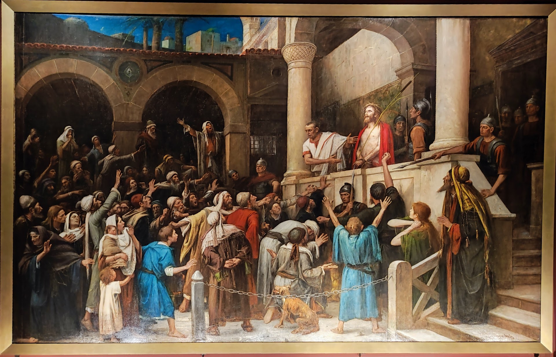 The emotional and spiritual peak is the Passion Trilogy by Mihály Munkácsy. In Ecce Homo, Pilate presents the scourged Christ to the crowd — a moment of theological intensity and moral judgment. In the final scene, the Crucifixion, the key traditional figures appear: Mary, John, Mary Magdalene, and Roman soldiers. Munkácsy turns the canvas into a true moral theatre, rich in pathos and layered interpretation.