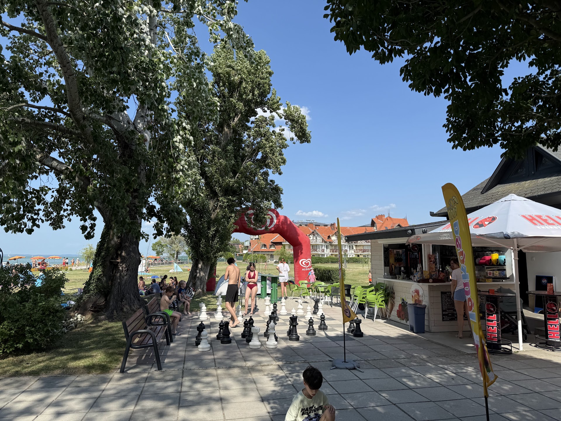one of the best beaches at the lake. Kid friendly and large area with all amenities . HUF 800 for a daily ticket is cheap (kids and elder paying HUF 300). There is a wellness area, which actually contains a kid friendly water complex and a pool to swim. You need to pay extra but kids love it. Giant slopes are okay, but only long and straight. Nothing special. They are not too strict with the age limit. Even 5year old can go usually. Parking is free, but come early! Tip: Next to the entrance to the right, there is a small dead end street, where you can...