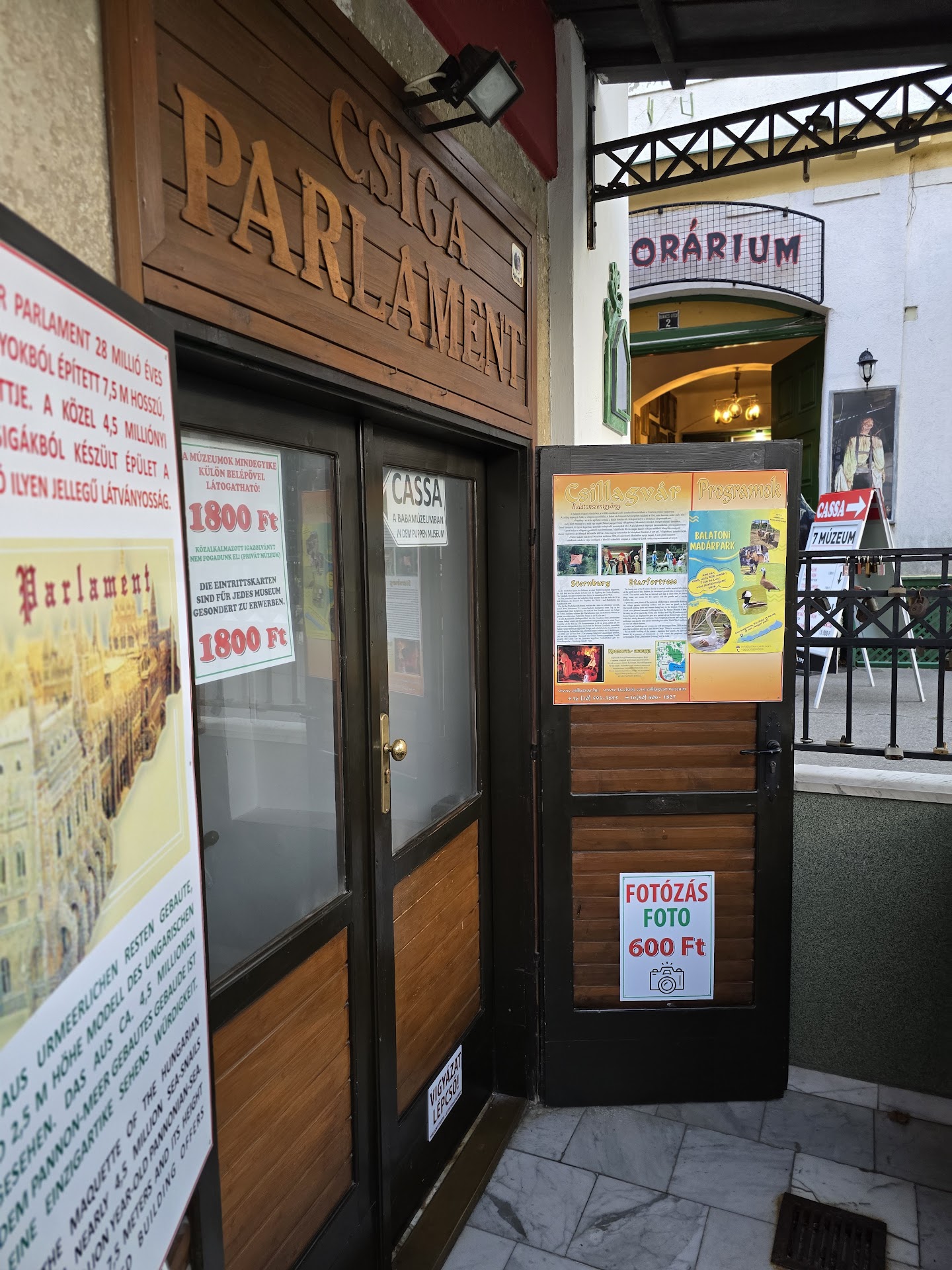 Most az más kérdés, hogy csak engem zavar hogy "Csigaparlament" mivel nem csigákból hanem csigaHÁZakból készült. De ami ennél sokkal jobban bosszantott az az, hogy 16:10 perckor odaértünk az ajtóhoz, amikor rájöttünk, hogy a mellette lévő "Babamúzeumban" kell jegyet váltani, ahová belépve egy hölgy "rácsodákozó" tekintettel nézett ránk, olyan érzést kiváltva belőlünk, hogy már azt is megbánjuk, hogy oda mentünk. (Ami később úgy is lett.) Elmondtuk, hogy 2 múzeum érdekelne minket a Csiga(ház)parlament és a Horrorárium és Kínzó múzeum. A hölgy közölte, hogy "Áh az nem nagyon fog menni, mert hát nem fér bele a 7 meg végképp nem". Nem értettük, hogy ez hogyan lehetséges, mert még 17:00 zárásig volt ugye 50 percünk. De a hölgy közölte velünk, hogy hát igen, de neki most hamarabb el is kell mennie mint 17:00 óra. Hogy tessék?? És hát nem 7, csak 2 helyet néznénk meg, de jó, legyen akkor csak 1, a Csiga(ház)parlament, hiszen gondoltuk, mégis csak az az egyedibb. Elindultunk, kinyitotta nekünk az ajtót, mi lementünk a pincébe és hiába beszéltünk hozzá, válasz nélkül ránkcsukta az ajtót, amin igencsak meglepődtünk, ugyan is azt nem mondta, hogy ő oda nem tart majd velünk. Mondanám, hogy "Váó" érzés fogott el a látványtól, de inkább azt éreztem, hogy ez meg mi a fene akar lenni, és tisztelem a készítő munkáját, az idejét és energiáját amit belefektetett, de hogy ezért a 2 perces "látványért" amit egy koszos ablakon keresztül bámulhatunk meg és 600Ft-os plusz költségért/fő fotózhatunk is le, az 1800 Ft-os/fő jegyért cserébe, egy dohos, sötét pincében, hát finoman fogalmazva is olyan "jól át lettél verve és még boldogan fizettél is érte" feelingje volt. Miután kijöttünk, a hölgy jött velünk szembe és a barátnőm itt már teljes csalódottságában annyit kérdezett, hogy nem lehetne e mégis megnézni valahogy a Horrort is, mennyi idő az, mivel akkor is még csak 16:25 volt. A hölgy közölte velünk, hogy "hááát, ha mindent elolvasgatunk a táblákon akkor nagyon sok idő, de ha csak a figurákat nézzük meg, akkor kb 10 perc." Végül nagy nehezen, de kaptunk jegyet újabb 1800 ft/ főért cserébe. Itt szintén csendben megjegyezném, hogy a 7 múzeumi jegy 5900 Ft/ fő! Bementünk, és hozzáteszem egy kb 5x5-ös szobába érkeztünk, pár figurával és kb 5-10 táblányi, pársoros leírással szembetalálkozva. A hely itt is katasztrófa volt, de elfogadom, hogy ízlések és pofonok ugye. Jelzem mindent végig ovasva sem volt 10 perc amit bent töltöttünk, de lehet nekünk van valami szuperhős képességünk, nem tudom. Senkinek sem ajánlom, főleg nem fizetősen, ilyen összegekért csodaszép kiállításokat és érdekfeszítő tárlatokat lehet megnézni, még ha nem is...