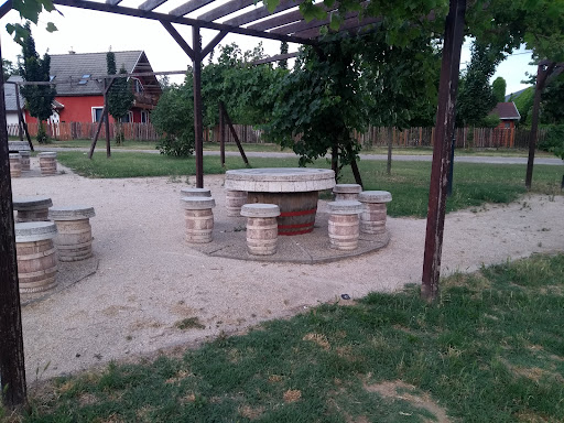 Hangulatos kialakítás, padok, asztalok, ahol meg lehet pihenni. Sakkasztal. A hangulatot a szőlő tőkék, vagyis a lugasok adják. Tájékoztató táblák, mutatva a 2 tanösvény vonalát, amelyek a Kilátóhoz, illetve a Pince falun vezetnek keresztül. Bár én a lefotózott rajz ellenére többször túlmentem, másik úton indultam el, de végülis...