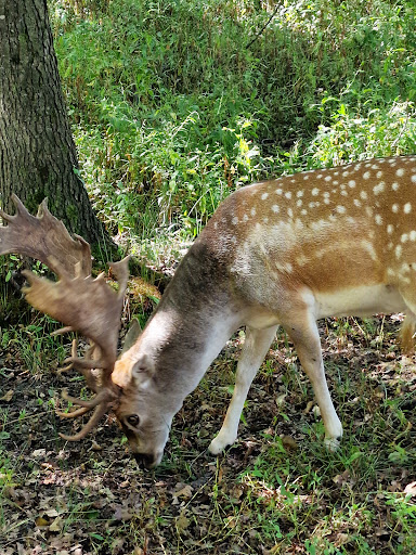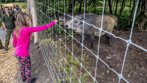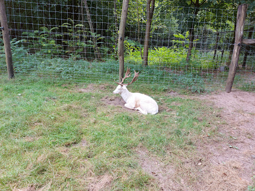 Ez valószínűleg nem egy attrakció, hanem csak egy lehetőség. Az ország talán leghíresebb vadászterületén csak egy ilyen szegényes vadasparkra futja. Ez akár kérdőmondat is lehetett volna... Az okait nem tudhatjuk ...de abból láthatjuk, ahogyan ez a park mutatja magát! Az eligazító tábla (ami a Vadasparkba vezetné az embert) kb 15 méterre az úttól a mezőn....és néhány cm-es betűkkel van megírva. Mozgó autóból észrevehetetlen és elolvashatatlan. A Vadaspark északi szélén, az úttól jó ötvenméternyi távolságra, egy bokorral félig eltakarva áll az az általános eligazító tábla, ami az összes attrakcióra ad eligazító irányjelzést....és aminek valahol a kisvasúti parkoló mellett - minden látogató szeme előtt - kellene lennie. Az útról ez a tábla nem látható.....csak akkor ha a közelébe érünk a vadasparki körséta végén. Parkoló, vagy legalább kijelölt gépkocsi megálló nincs, így marad az út széle, ahol kb 3-5 gépkocsi férhet el. Sajnos nem voltunk olyan szerencsések, hogy vaddisznót lássunk....a két szarvast láttuk, de simogatásról szó sem lehetett! Az állatok etetése és simogatása ... a kerítésen benyúlni tilos. És ez így helyes! Persze az állatok közelsége és fenséges látványa mindig érdekes, de a körülmények sajnos rontják...