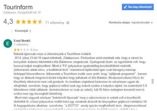 Nekünk igencsak rossz a véleményünk a Tourinform irodáról. július 23-tól 10 napot töltöttünk, Zalakaroson. Elsősorban azért mentünk oda, hogy a várost és környékét -különös tekintettel a Kis-Balatonra- megnézzük. Gyalogosok lévén az egyértelmű volt, hogy busszal tudjuk megközeliteni. Mivel a "Fő" pályaudvar gyakorlatilag buszbeállóként müködik (információs ablak nincs, a beállóknál lévő " menetrend tájékoztató igen csak hézagos) másnap térképpel felszerelkezve felkerestük a Tourinform irodát, nem azért, hogy "ajáljanak programot" , hanem hogy az általunk megnézni kivánt helyekre hogy juthatunk el (Kis-Balaton, Bivalyrezervátum) Hévíz és Keszthely elérésével nem volt gondunk. Az irodában végtelenül kedvesen és udvariasan ugyan de elhajtottak, mondván, hogy gépkocsi nélkül csak úgy tudunk ezekre a helyekre eljutni, ha esetenként 5-8 kilométeres sétát vállalunk (természetesen ez csak az odaút), hát 35 fokos melegben koromról nem is szólva nem egy kecsegtető lehetőség. Mivel nem vagyunk amolyan "beletörödő tipusuak" meg a vakszerencse is velünk volt a következőt deritettük ki, a busz pályaudvar mellől indul egy vonatnak álcázott de lényegében gépkocsi vontatású 54 fő begogadására alkalmas szerelvény "a DOTTO" amely igazán megfizethető áron, idegenvezetéssel egybekötve körbeviszi a nagyérdeműt a város nevezetességein, bortútát szervez, amiből a bor a legkevésbé érdekes, a város más részeit mutatja be rajta és hetente kétszer (szerdán és szombaton délelőtt) elvisz a Bivalyrezervátumba és a Kis-Balaton Kányavári szigetére. Ja, hogy el ne felejtsem, a Héviz-Keszthelyre közlekedő azon buszok amelyek Zalaváron keresztűl érik el a céljukat a Kis-Balaton csücskén állnak meg max 200 méterre a víztől illetve a Tájközponttól (vagy minek hívják) a Kis-Balatont és a környék településeinek történelmének témáját feldolgozó múzeummal. Egyszóval mindent láttunk amire kiváncsiak voltunk. Ezt nem csak mérgünk levezetésére írtam meg, hanem hátha rajtunk kivül is van olyan "ütődött mezitlábas" aki nem vagy nem csak azért megy Karosra, hogy reggeltől estig dagonyázzon, hanem az igazán szép környék "felderítésének"...