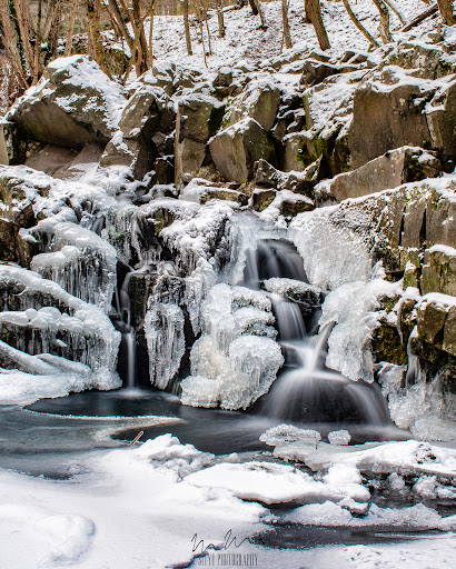 Gyönyörű látvány befagyott formájában a Bükkös-patak. Néhol a fagyott felszín betört, beszakadt, ott látszik ahogy csörgedezik a patak vize. Keskeny, meredek lépcsőfokok vezetnek le egy szintig, onnan a mederig hatalmas kőtömbökön...