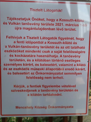 Read moreMaga a kilátás természetesen szuper. Viszont vérlázító, hogy kiírja a mencshelyi önkormányzat, hogy saját felelősségre lehet felmenni, mert már magántulajdonban van. Én ezt komolyan nem értem, felépíteni volt pénz meg EU támogatás, felújítani már nincs?? És ha tényleg veszélyessé válik? Látszik rajta, hogy már kéne festeni, karban tartani. Ki ellenőrzi mondjuk évente? Ki fogja lezárni, hogy haláleset ne történjen? Az aki a mostani tulajdonos? Hogy kerülhet egy tanösvény és egy kilátó egyáltalán magántulajdonba? Olyan gyalázatos ez az egész, otromba felelőtlenség, hogy...