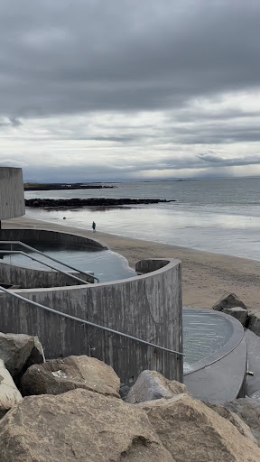 You can’t find better place to have true Icelandic experience..chilling in hot thermal water (appx.+40C) at the upper level and then plunging into the ocean (+12C) was truly a HIGHLIGHT of my experience in August 2023. Changing rooms are pretty simple and cold, you can leave some clothes there (not under supervision) or take it all with you and with other valuables. WC is in separate building next to the cashier (no sockets for hairdryer). You can rent swimsuits, bathrobes, swimming shoes and towels there. Showers outside only (pay attention, really hot water). Visit on a weekday as it is crowded with locals at weekends. Free parking just...