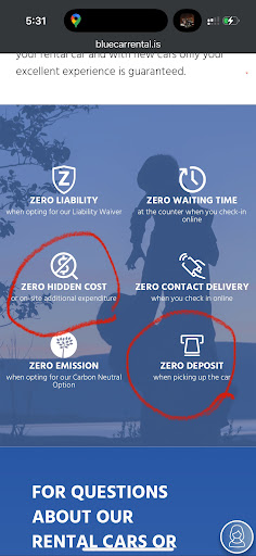 Read moreI have been renting cars for the past 8 years, and I was incorrectly informed that the international car rental company I rent from does not have a branch in Reykjavik only in the airport. I had planned a road trip on the ring road for the second week of my vacation in Iceland. As soon as I booked online with blue car rental, I was charged 20% of the fees. The cancellation period goes back three weeks prior to rental pick-up time otherwise it’s non-refundable. I thought this was odd but no matter I kept my reservation. The rates were approximately 30-40% higher than other rental companies. Pick- up: The representative did not conduct inspection with me, there were several dents and scratches on the car. They had vaguely indicated the damages on the contract. They also indicated the fuel level as full and it wasn’t. Drop-off: there was a severe weather warning and we were advised to either change travel arrangements or be very careful. I was driving from the affected zone and I called the office ahead of time to warn them I am most likely going to be late, by 10 mins after closing time. I was told it would be fine. I arrive at the office and the office is completely closed with no employees in sight. The area the office is located at is very industrial and unwelcoming. I call the general office number and after 5 rings I get a gentleman on the phone, and I am expecting reasonable arrangement for drop-off. I propose to drop off the keys in the mail slot in the door. I got threatened that if I do that “We will call the cops on you”. I explain politely that I do not need the car as my flight is next day and I had already arranged for shuttle transport. “We do not care, this is your responsibility since you are late”. I ask for a solution. “You’re going to have to come back tomorrow when the office is open and we will charge you for an extra day”. I explain that I didn’t budget for this… “We will deal with you tomorrow”. I ended up bringing it to the airport office, charged for an extra day, and a service fee of about 40$ because the tank wasn’t at the exact full mark. I did my best to fill it from the last gas station on the road and it a hairline under full. I wasn’t offered a shuttle to the airport terminal. It’s relatively close when you are not carrying luggage but very tedious and I had to drag my duffel bag across the asphalt. Not something you would expect after putting 800$ in a car rental. This is the poorest customer service experience. Please be warned and consider...
