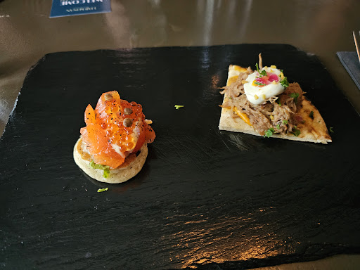 Lightly cured arctic char on a chickpea blini with horseradish sauce, yuzu-elderflower dressing, crispy lentils and fish roe.