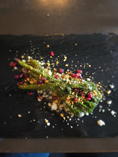 Lightly cured arctic char on a chickpea blini with horseradish sauce, yuzu-elderflower dressing, crispy lentils and fish roe.