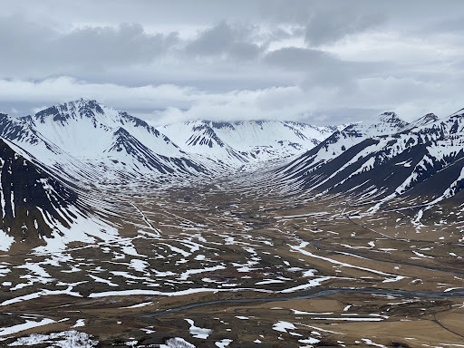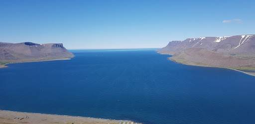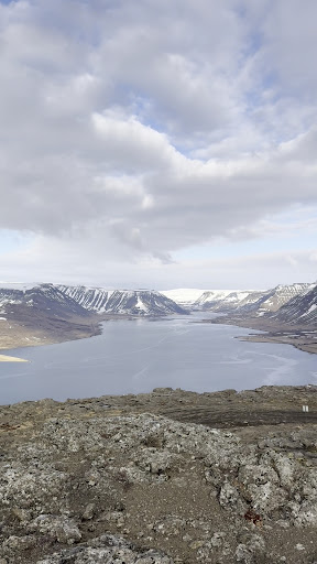 From the town of Thingeyri, use Google Maps and drive to mountain Sandafell. You will climb about half the mountain in your car, and can then park in a gravel parking (more like a wide gravel shoulder) where you see the square-with-loops sign (point of interest sign). From there on, you will walk up the mountain on a dirt/rocky road, which is only OK for either hiking or for a high clearance 4x4 - not a regular AWD SUV. There is nowhere to turn around on this dirt road. The hike is about 2 miles (uphill, not too steep but there’s no respite from the incline) up to the antenna tower, and you can continue past that until the edge too (we stopped a little ways short of the mobile tower). No matter where you hike until, you will see stunning views on both sides. The town also looks incredibly cute from the high vantage point. And the fjord looks just...