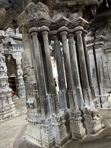 The temple amazes with its rare and unique architectural features. What welcomes the pilgrim is the imposing seven storeyed 134 feet tall white Gopuram replete with detailed carvings in the traditional Dravidian style of the grand temples. There is a 13 feet high and 10 feet wide idol of Nandi next to the Swayam Bhu Lingam, which is made of crushed seashells and lime mortar. Moving inside, another wonder that testifies to the expertise of the artisans of old awaits the visitor -- the four groups of 18 feet tall musical pillars carved out of monoliths. The pillars, when tapped, emits a variety of musically correct notes and this is a major attraction. Moving into the long corridor/hallway, one is staggered by the 1035 carved pillars lining the hallway. These are second perhaps only to those at the huge corridors of the Rameswaram temple. The Navagraha scuptures engraved on the ceiling of the temple mandapam are truly exquisite examples of the sculptor's art.