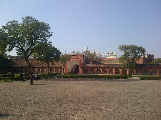 Read moreIt is situated between the white marble Khas Mahal and the red stone Jahangiri Mahal and is set, transitionally, in between these two major residential complexes of two different ages. It is the earliest attempt of the Mughal Emperor Shah Jahan to convert an existing redstone building in accordance with his taste. It is his earliest palace in Agra Fort and has a large hall and side rooms, and an octagonal tower on the river side. The skeletal construction of the brick masonry and red stone were all white, stuccoed with a thick plaster and colourfully painted with floral designs. The whole palace once glistened white, like white marble. On its face towards the Khas Mahal is a white marble dalan, composed of five nine-cusped arches supported on double pillars and protected externally by a Chhajja. Its western bay was closed to house the Ghaznin gate. Babur's baoli and well are situated beneath it. The subterranean apartments in several stories are also situated under...