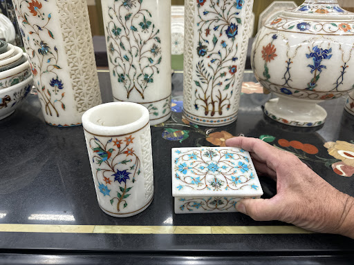 This is the place to visit if you're considering buying marble inlay art that is local to Agra. They claim to be the ones who started this business in Agra town so you know that they're someone whom you can rely on. They walk you through then process of how the inlay work is done on the marble block. They have real artists inside shop who are doing the actual work unlike in other shops where they have a dummy artist just for show. Their collection is impeccable. They showcase some artwork that should actually be part of a museum. Of course that's not for sale. But what they sell is excuisite. The minute details like the stem of a leaf in the inlay artwork is so intricate that reveals expertise of their artists who are with them for generations over. If you ask them, they will show you samples of difference in their work and others in town. The salesman is very polite and understands your tastes quickly and shows you what you may like. Prices are reasonable. Whether you want to carry the marble piece with you or you want them to ship it, they can do it for you. We carried our purchase with us on flight in carry on. They packed it well so we had no issues during our flight. Security may ask during security check in but you can tell them its a marble block with artist work and they will allow it. So nothing to worry about if you're carrying it with you. All in all we are very satisfied with the purchase and I would highly recommend if you're considering supporting this art for that's...