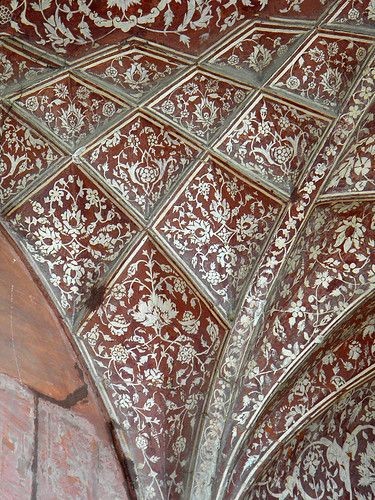 The interior of the tomb bears calligraphy reflective of the tenets of Din-e-Ilahi, a religious movement founded by Akbar that brought together Islam, Hinduism and several other faiths. The true tomb, as in other mausoleums, called last Sanori as it was decorated with gold. It is in the basement. There are few gold flowers still carved at the top of the tomb most of them were looted during the sudden attack. The buildings are constructed mainly from a deep red sandstone, enriched with features in white marble. Decorated inlaid panels of these materials and a black slate adorn the tomb and the main gatehouse. Panel designs are geometric, floral and calligraphic, and prefigure the more complex and subtle designs later incorporated in Itmad-ud-Daulah's Tomb.