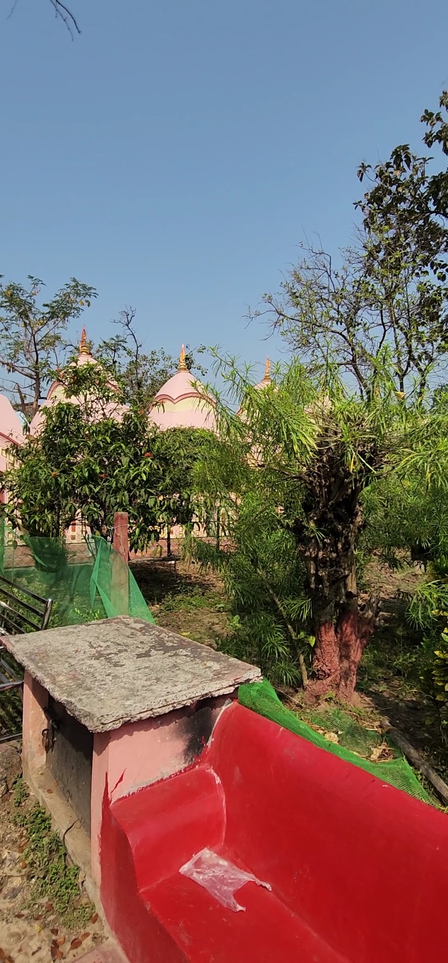 The complex is decorated beautifully with tree lined pathways surrounding the two ponds. Flight of stairs lead to the pond water in the complex allowing the devotees to wash their hands. There is a pavilion located near the entrance between the ponds topped with a spire which provides shade to devotees. At present the temple complex is under the purview of 108 Shiv Mandir Trust Board, who have taken the initiative of constructing a guest house for devotees visiting the temple. In 2013 a fund from the West Bengal Tourism Department led to the construction of a parking lot in front of the temple complex.