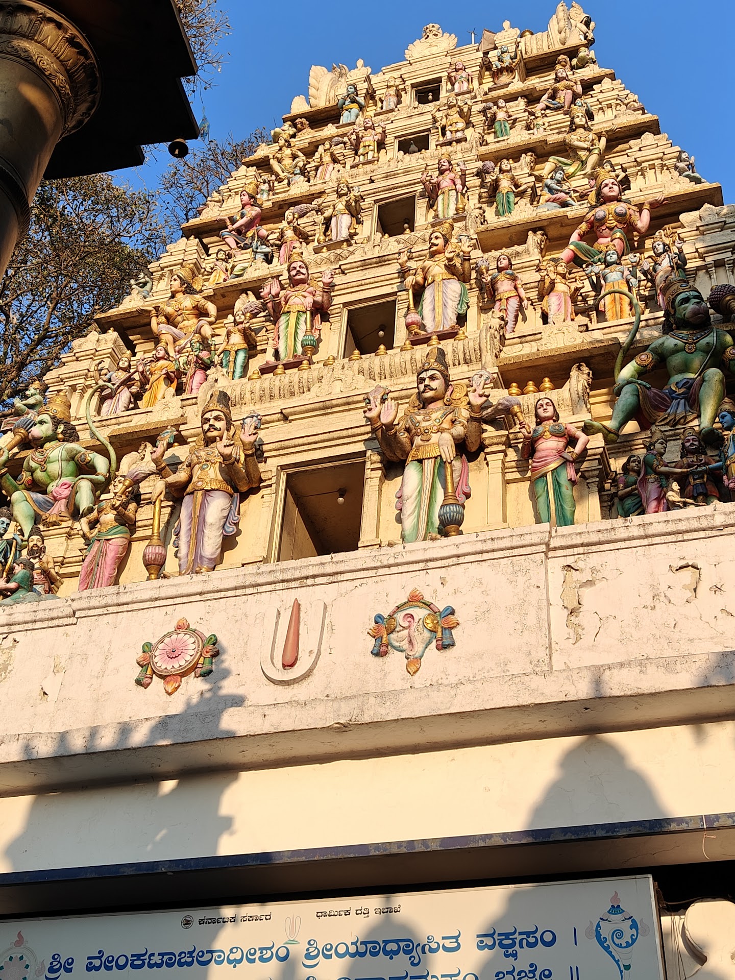 Read moreMy friend had told me so many times about this beautiful temple, I decided I must visit it, and went there. Google said the temple opens at 5pm in the evenings. When I reached at about 5.20 pm, it was closed. I took a walk, and came back around 5.35 - the main door was open. But inside, there was not a single soul. I was actually thrilled - I would have God all to myself before the crowd builds up, I thought. But God was not interested in me. The shrine was still closed. I went around, admiring the beautiful carvings, reading all the wonderful display boards which tell the history of the temple. About how Venkataramana Swamy actually saved Tipu Sultan from certain death when Governor Cornwallis fired a cannon at Tipu's palace adjacent to the temple - the Lord took the cannon on Himself, and spared Tipu. Apparently Tipu was grateful. ( my guess is, that was for a short time - before he decided to do away with all "infidels"). The architecture is stunning, carvings bringing the characters to life. The general feeling one gets is of being in a great, serene place, very clean, and full of positive vibes. But I was disappointed that there was hardly anyone to enjoy the beauty of the place. As I reluctantly left, I met a young man enter the temple precincts, carrying a big container (?milk). I asked him why the shrine was not open. He said it would open by 6 pm or so, as people do not come earlier than that. Coming as I was from visiting the Golden temple at Amritsar just a few days back, which is open 24 hours a day with visitors milling about all day and all night, the poignancy hit me hard. I left with a heavy heart. I would have to go again to get a darshan, and the prasadam, which I am told by my friend, is wonderful...