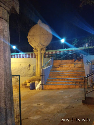 This Mandapa is in a court yard, which treasures Stone edifice of the TRISHUL & DAMRU on pillars on both sides of the compound. Apart from these are two massive Stone discs on pillars facing each other with the small but elongated Bali Peetham, Dhwaja Sthambam and the Nandi Mandapam with a small but beautiful Nandi.
