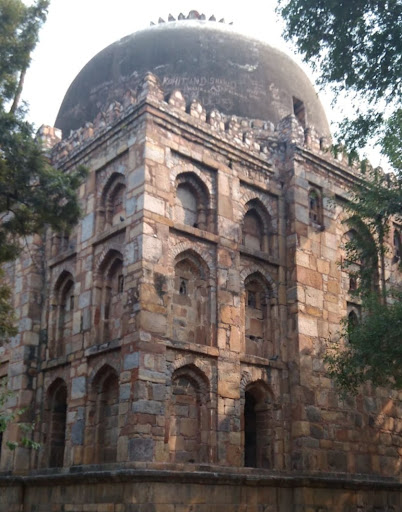 Surrounded by unruly vegetation and massive trees is this imposing structure with walled quibla or mosque on one side. The facade of the monument gives a false impression of it being three- storey. Three sides of the monument have trabeated entrances barred with locked grill doors and the forth west one that faces Mecca has a mehrab recess characteristic of all the Lodi era structures. It is decorated with Quranic inscriptions.