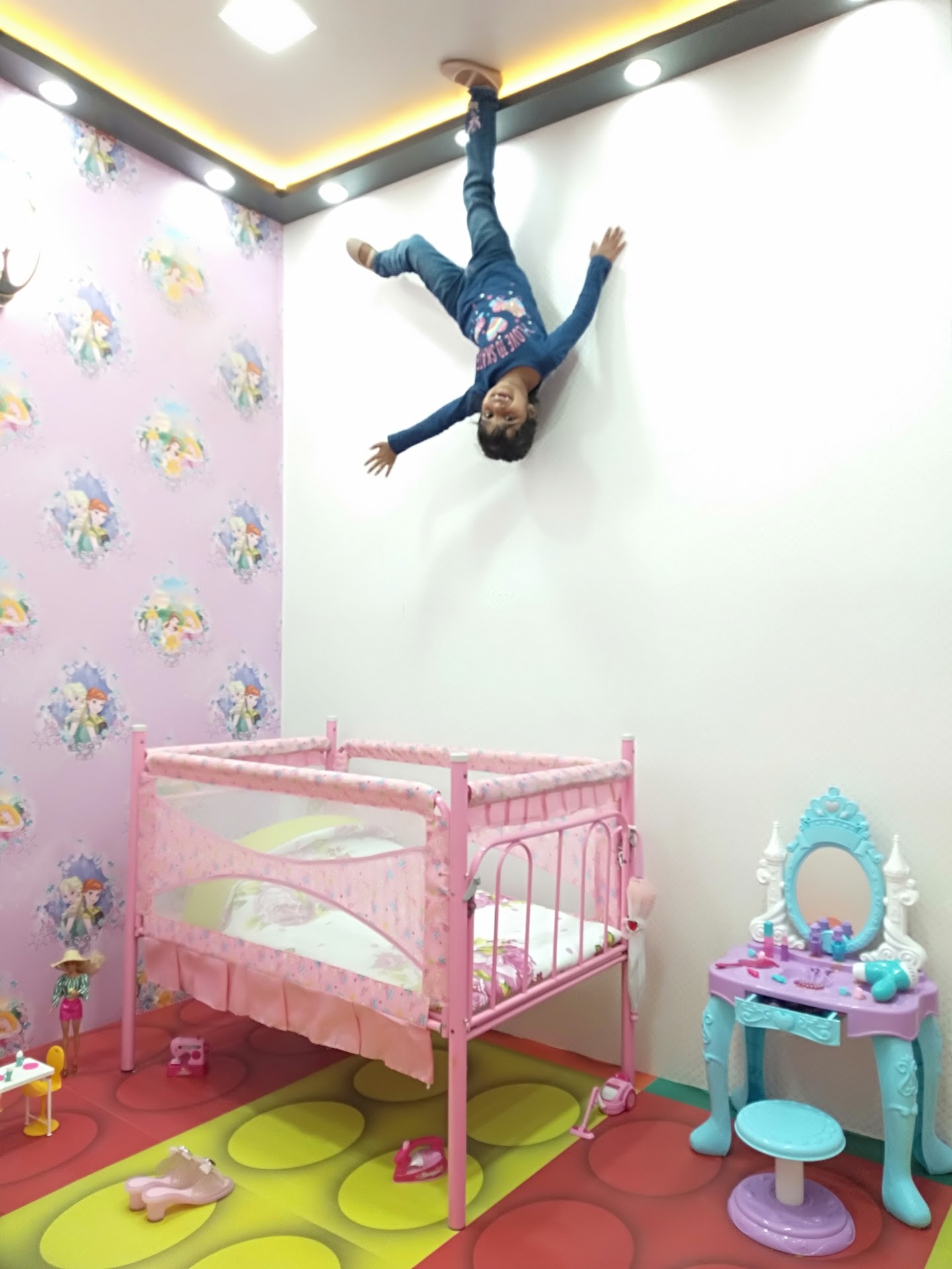 They have created various rooms of regular house with all items hanging upside down. It include car park, drawing room, kitchen, bed room, bathroom, kitchen and children's room. The articles used are real with real size, even the Tata Nano car and a scooter which you find hanging upside down.