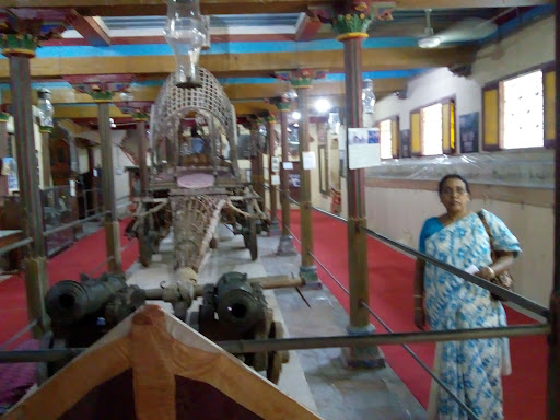 The other collection include English, French and Dutch chiming clocks; glass wares; china wares; mechanical toys; celestial globes; arms; palanquin; glass paintings with Chinese influences; old pictures and paintings. The inner chamber is surrounded by a corridors. The walls of the corridor have several Indian and few European paintings which includes 18th-century engravings of A Rake's Progress by William Hogarth, portraits of royals such as Catherine the Great as well as paintings depicting the courts and portraits of Maharao and his successors including some with Mughal influences. There is a 15 metre long scroll painting the Maharao riding a decorated elephant and his procession including a flag bearer, drummers and infantry. Occasionally real gems are introduced on the surface of painting where ornaments such as ear-rings and necklaces are depicted. There is a pendulum clock synchronized with Hindu calendar.The collection also include Mahi Maratib, a golden fish, which formed part of coat of arms of Cutch State which was gifted to Maharao Lakhpatji by Mughal Emperor during his...