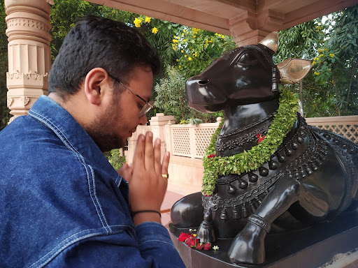 The temple complex features a central domed structure built with intricately carved pink sandstone. Stepping through the ornate wooden doorway, you're greeted by the calming presence of the Shivalinga, said to resemble the one enshrined in the famed Somnath temple. The priests perform daily rituals with reverence, adding to the spiritual aura of the place.