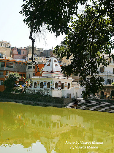 There are two temples around the pond, the ancient poorly maintained Ramkundi Shiva temple and the well maintained multiple linga Shiva Temple.