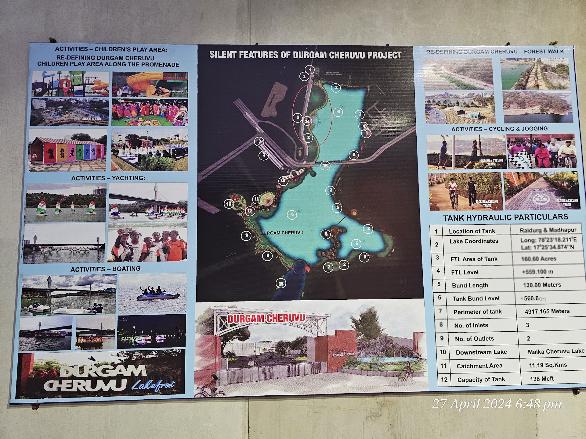 🚤 Activities & Attractions Boating Options • Paddle boats • Mechanized boats • Speed boats • Water scooters (Jet Ski) • Charges range from ₹20 to ₹500 depending on the type of ride Floating Restaurant • Capacity for about 40 people • Duration: ~40–45 minutes ride on the lake • Ticket cost: ~₹200 per person Adventure Activities • Rock climbing • Rappelling • Trekking • Kayaking Fishing (Angling) • Popular among weekend visitors • Common fish: Rohu, Catla, and others Evening Attractions • Musical/dancing fountains • Artificial waterfalls • Beautifully illuminated cable bridge in the evenings