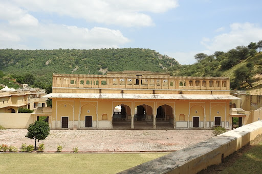 The entire landscape of the garden speaks volumes about the amalgamation of two cultures with respect to design, architecture and art. There are courtyards between palace complexes and each one of the three palace complexes, namely the Vidyadhar palace, the Neela Mahal and the Raj Niwas, have their own separate colour scheme with varied designs. The gardens are sectioned between the complexes and are also very well manicured. The pavilions, courtyards, palaces and chhatris blend in extremely well with the surrounding hills.