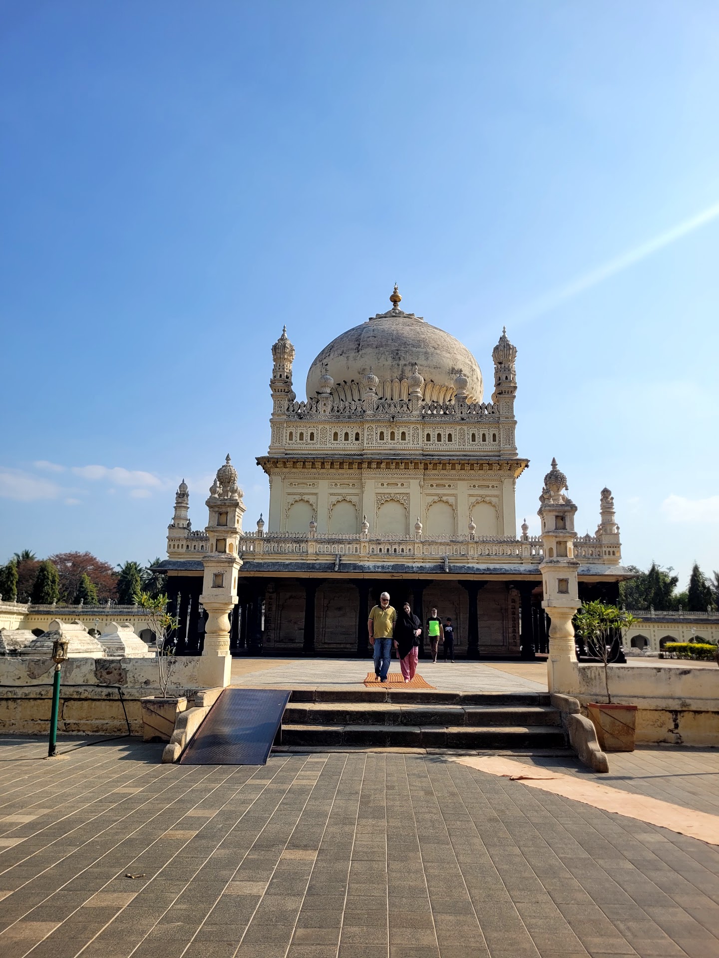 The Gumbaz was raised by Tipu Sultan in 1782-84 at Srirangapattana to serve as a mausoleum for his father and mother. The mausoleum was surrounded by a cypress garden which is said to have different species of flowering trees and plants collected by Tippu Sultan from Persia, Ottoman Turkey, Kabul and French Mauritius. The original carved doors of the mausoleum have been removed and are now displayed at the Victoria and Albert Museum, London. The present doors made of ebony and decorated with ivory were gifted by Lord Dalhousie.