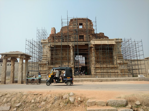 Read moreBeautiful Architecture. The Krishna temple, also called Balakrishna temple, on the other side of Hemakuta hill, is about 1 kilometre (0.62 mi) south of Virupaksha temple. It is dated to 1515 CE; this part of the Hampi complex is called Krishnapura in inscriptions. In front of the ruined temple is a long market street, also referred to locally as the bazaar. Between the colonnaded stone shop ruins is a broad road that allowed chariots to transport goods to and from the market, and hosted ceremonial functions and festive celebrations. To the north of this road and middle of the market is a large Pushkarani—a public utility-stepped water tank with an artistic pavilion in its centre. Next to the tank is a public hall (mandapa) for people to sit. The temple opens to the east; it has a gateway with reliefs of all ten avatars of Vishnu starting with Matsya at the bottom. Inside is the ruined temple for Krishna and small, ruined shrines for goddesses. The temple compound is layered into mandapas, including an outer and an inner enclosure. The compound has two gopuram entrances. Inside, a 25 (5x5)-bay open mandapa leads to a 9 (3x3)-bay enclosed mandapa. The original image of Balakrishna (baby Krishna) in its sanctum is now in a Chennai museum. A modern road passes in front of the eastern gopura, linking Kamalapuram to Hampi. The western gopuram has friezes of battle formation and soldiers. South of the Krishna temple's exterior are two adjacent shrines, one containing the largest monolithic Shiva Linga and the other with the largest monolithic Yoga-Narasimha avatar of Vishnu in Hampi. The 3 metres (9.8 ft) Shiva Linga stands in water in a cubical chamber and has three eyes sketched on its top. South of this is the shrine for a 6.7 metres (22 ft)-high Narasimha—the man-lion avatar of Vishnu—seated in a yoga position. The Narasimha monolith originally had goddess Lakshmi with him, but it shows signs of extensive damage and a carbon-stained floor—evidence of attempts to burn the shrine down. The statue has been cleaned and parts of the shrine have been restored (Info...