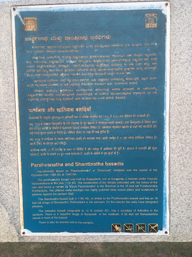 Halebidu was the capital of the Hoysala Empire between the 11th to 14th century CE when Jainism maintained a strong presence in the region. The region was called Dorasamudra or Dwarasamundra during the rule of Hoysala. Bittiga (later became Vishnuvardhana), is considered the greatest ruler of Hoysala kingdom and was a Jain till around 1115 AD, after which he converted to Vaishnavism under the influence of the Hindu saint Ramanujacharya. King Vishnuvardhana's wife Shantala Devi, remained a devout follower of Jainism. These temple were later maintained by Maharaja of Mysore. There are three basadis in this complex.