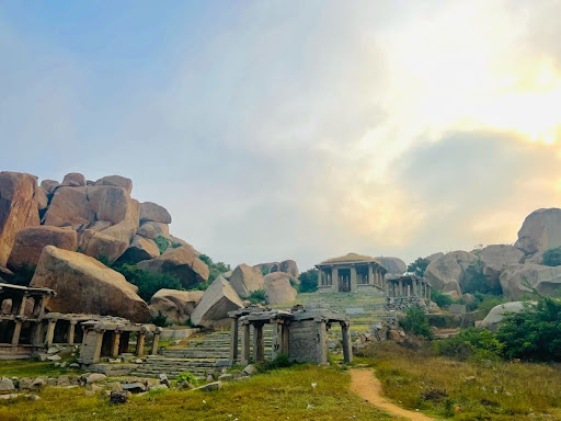 The journey to the summit begins with a moderately challenging hike, which winds through the striking rocky terrain that surrounds Hampi. As you ascend, you'll discover ancient temples and ruins nestled amidst the boulders, offering an intriguing glimpse into the past and the architectural marvels of the Vijayanagara Empire.