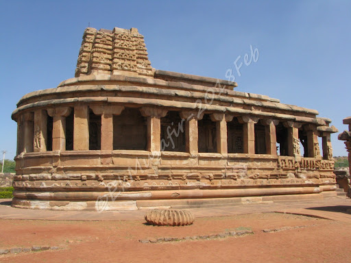 Originally it was a Surya temple. This temple was built by Aatada Ale Komarasingha during the days of Vikramaditya II. It is one of the examples of experiments in temple designing that took place at Aihole,and it is apsidal in shape with its back resembling the hind part of an elephant (gajaprishtha).Standing on a high pedestal. It has a fallen Rekhanagara Shikhara; Its collonade divideds the temple into apse and ailes, and the columns pass behind the apsidal sanctum. It has a frontalMantapa with steps to reach the temple from the east and the west. The temple is surrounded by aparapet and short pillars support its roof together with the inner Colonnade. Its exterior has fine Ramayana scenes. The Mantapa pillars have fi gures of gods and goddesses and amorous couple.The Devakoshtas on the exterior have Shiva riding Nandi, Vishnu, Mahishamardini and othervigorous images.