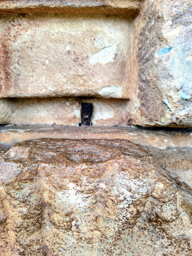 The Durga temple is the principal attraction for Aihole visitors and iconic in its apsidal layout.This shape is similar to 2nd or 1st century BCE Buddhist chaitya halls found in Ajanta Caves. The Durga temple stands on a high moulded adisthana and a damaged tower that had a curvilinear shikhara. The damaged tower's amalaka crown lies on the ground. A colonnaded and covered ambulatory passage with major carvings runs around the sanctum. The mukha mandapa (main hall) and the sabha mandapa (community hall for functions) show intricate carvings.