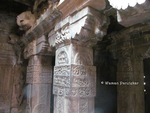 Mallikarjuna temple, also known as Trilokeshwara temple, is named after the second queen Trilokamahadevi who built it This temple was built in 745 AD to honor her husband’s victory over Pallavas This is a smaller version of the Virupaksha temple, but here the tower is topped by a dome, whereas Virupaksha temple tower has a square top. This temple has 18 pillars dedicated to the Ramayana & the Mahabharata. Outer wall has pierced screens alternating the sculptures On the ceiling is a panel of Durga fighting the buffalo demon One panel shows wrestlers engaged in matches & in another elephant toppling the tree Another column relief depicts Samudra manthan wherein Gods & demons at either ends of a churning rope, Vasuki wrapped around Vishnu, churn the cosmic ocean (Sea of Milk) to...