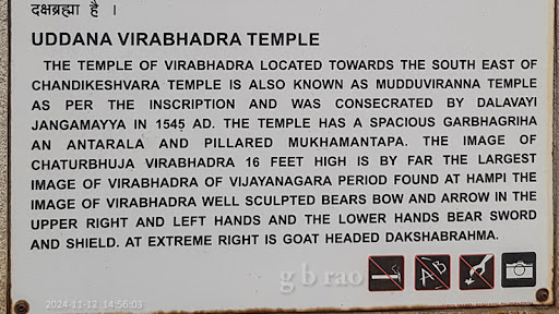 Visited Nov 2024. One of the oldest temples in Hampi. Relatively simple and bare compared to the other temples in Hampi. There is a rare, at least in south India, sati paliya (stone) just outside this mandir. Pics attached. Quote: The 3.6 meter high monolithic idol of Uddana Veerabhadra is the main deity here. The idol is carved with four arms holding an arrow, sword, bow and shield, depicting the warrior nature. A tiny idol of Daksha too is placed nearby. The twin superimposed Linga (called Sarvanga Linga ) installed at this temple is unusual for its form .The priests of this temple are of Lingayath community (a deviation from the tradition – the...