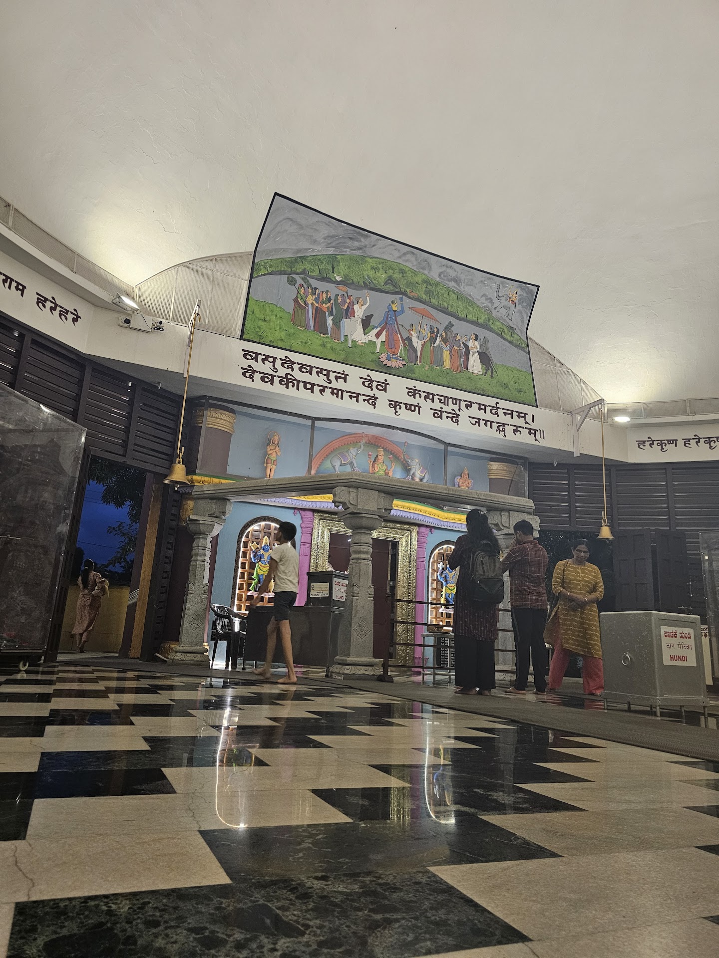 I visited the Sri Venugopal Temple in Manipal in the evening, when the campus was slowly beginning to settle down after a busy day. The temple itself stood quietly, surrounded by clean open lawns and pathways, creating an immediate sense of peace as I walked in. Inside, the sanctum looked beautiful. The idol of Lord Venugopal, draped in bright orange silk with a silver crown and ornaments, looked divine and graceful. The peacock feather in the crown caught my attention instantly, as did the fresh tulsi and jasmine garlands that added both colour and fragrance. A tricolour backdrop framed the idol, making it appear even more vibrant and majestic.