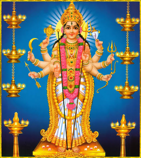 Goddess Parvathy had just arrived on the banks of river Ganga. Echoes of the mantras reached her. There was a touch of grief and pleading in the sounds of Devas. Goddess Parvathy grasped the pitiable plight of Devas. There emerged another Goddess from within her as if something comes out of a cover. This was the incarnation of Goddess Durga, having taken a divine form to rescue the Devas from the hardships caused by the asuras. The story culminates in a terrible fight between the "Goddess and Asuras under the leadership of Sumba and Nishumbha. It was an encounter unheard of ever before. Needless to specify, all the asuras were annihilated by the Goddess. The Devas got back the early powers and prosperities. Sage Narada appears in front of them and exults them about the invincibility of goddess Durga. She was the cause as well as witness for the creation, maintenance and destruction the universe, told Narada.