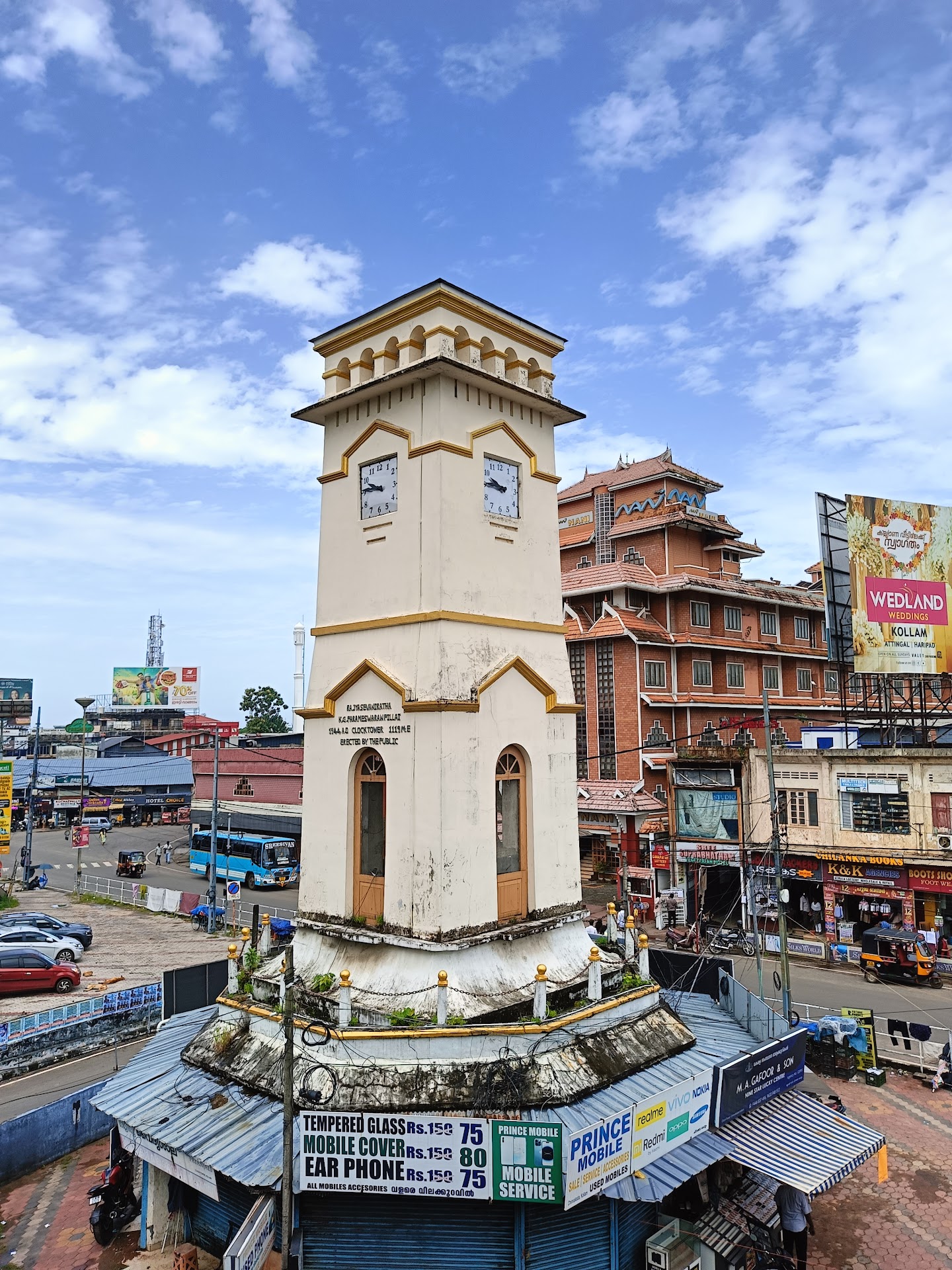 Read moreI visited the iconic Chinnakada Clock Tower during a trip to Kollam, and it truly stands as the beating heart of the cityâs hustle and bustle. Erected in 1944, this quadrangular tower was built to honor K.âŻG.âŻParameswaran Pillai, a former municipal chairman, and was the first clock tower in the old Travancore state . Made of brick and white cement, with clocks on all four faces brought from Kolkata (and originally England), it still keeps accurate time today .