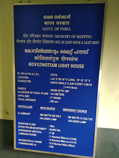 ย ย ย Read moreThe Kovilthottam Lighthouse is located in Kollam, Kerala, India. It stands tall on the shores of the Arabian Sea, providing guidance to ships navigating the coastal waters. The lighthouse offers panoramic views of the surrounding area, including the coastline and the sea. It serves as both a functional navigational aid and a popular tourist attraction, drawing visitors who are interested in its historical significance and the stunning vistas it offers...