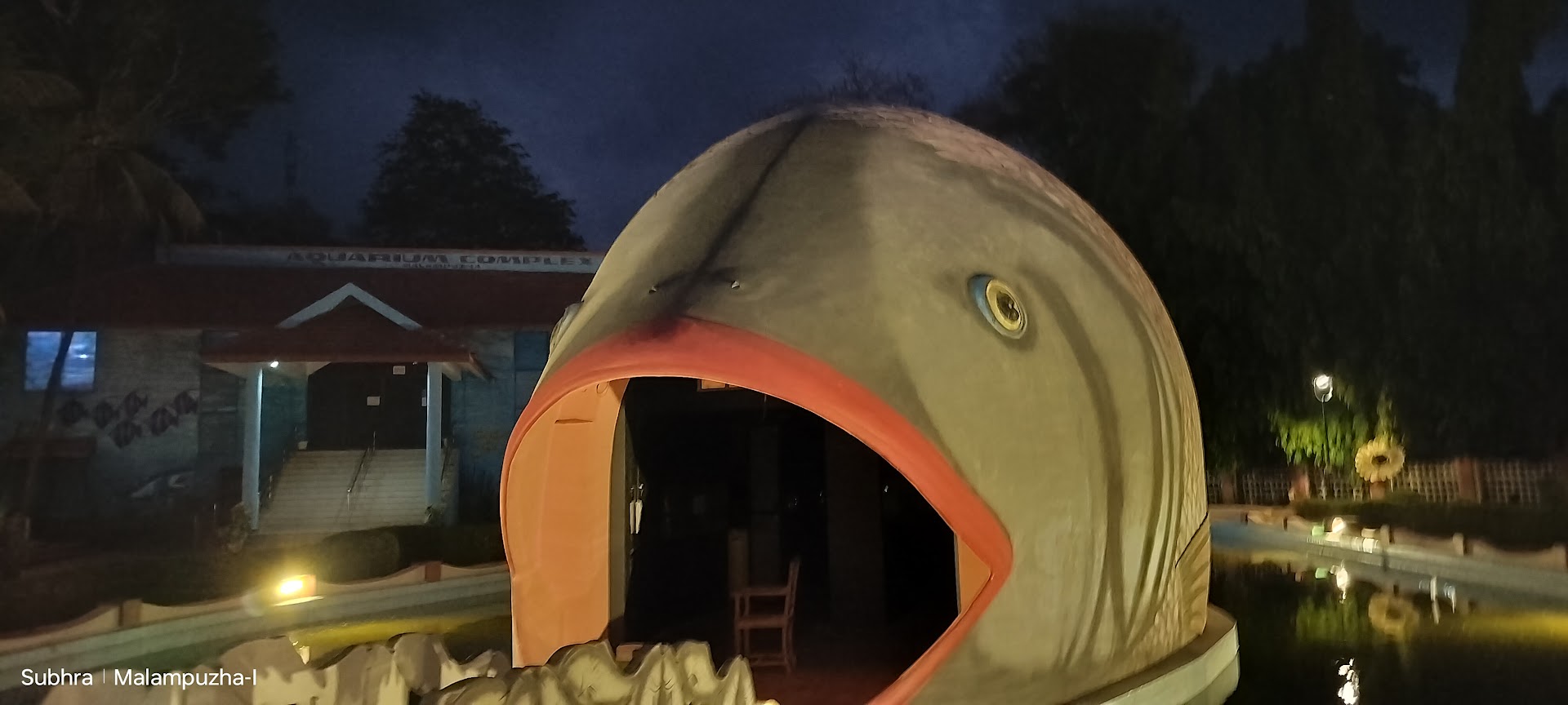 A fresh-water aquarium, shaped like a giant fish, is situated outside the Malampuzha Gardens on the way to the Ropeway entrance. Visitors get inside the aquarium through the wide opened mouth of the fish. Though not having a large collection, various varieties of fishes and other marine specimen are exhibited. The aquarium is open from 10:00 AM to 8:00 PM. The aquarium is operated by the Kerala Governemt Fisheries Department.