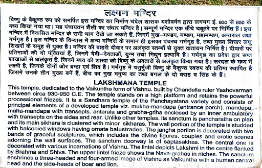 LAKSHMAN TEMPLE : This striking temple stands facing the varaha and Devi mandaps. It is one of the three largest temples of khajuraho and the western group of temples and is considered to be the earliest ( c.AD 954 ) to have been built by the chandella rulers. The temples faces the east and is dedeicated to vishnu, though it goes by a rather inappropriate name of lakshman, the brother of Ram, the hero...