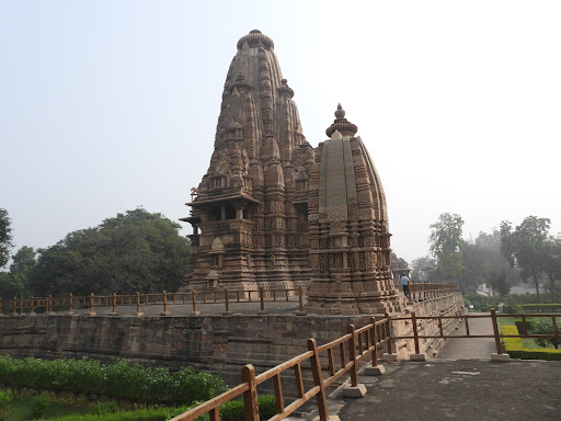 Like Lakshmana temple it is built on a rectangular raised platform and all the four corners with small shrines among only two structures are surviving. Principal diety is housed in the central Grand temple. It was built by Dhanga during his reign in 999 to 1002 AD according to the inscription affixed in the temple. It was dedicated to Lord Shiva and Sanctum Sanctorum was housing two signs of Lord Shiva in the form of Lingas one Markateshvara and the other Pramathanatha and were built of Emarald, though original missing. One side spectators can see the elephant statue and lion statue either side of the steps flights while accessing the temple. Entrance porch, hall, balconied windows, vestibule mean Antarala, circumambulatory, sanctum Sanctorum including the mythical and decorated alluring Sculptures are leaving spectators surprised. Exterior walls are having the decorated niches and the three folded Sculptures and decorative motifs. The temple depicts the idealized woman and her various roles and abilities through vibrant craftsmanship and sculpture. The loving couple are symbols of divine union and salvation. Major niches are housing the magnificent sculptures of Parvati, dancing Ganesha, Septmatrika etc including the graceful beauties engage in make up, dressing, teasing with their curves etc. Also displays the sculptures of love making couples in yogic or acrobatic forms and beauties are supporting the couples. Even like the Sculptures on the plinth of Lakshmana temple bestiality sex means the display of men's unethical or evil face can be noticed on the exterior walls. Spires on roof are very attractive. Completely built by sand stone and carvings and engraving sculptures on sand stone display the excellence of the workers.