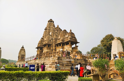 Read moreVishwanatha Temple (1002 CE). The Vishwanatha Temple, is third largest temple of Khajuraho Temples, stands on the north-east extreme of the Western group of temples. Architecturally, the temple falls between the other largest Lakshmana and Kandariya Mahadeva temples. A precursor in design and ornamentation to the Kandariya Mahadeva, this is one of the finest and best preserved temples at Khajuraho. ARCHITECTURE Among the Khajuraho temples, Visvanatha temple is the finest and best preserved example of Chandella architecture and is dedicated to the Lord Shiva. It used to be a Panchayatana shrine but now, out of its four subsidiary shrines only two. ie. Northeast and Southwest exists. The structure shows all the elements of a developed temple including the mukha-mandapa (entrance porch), mandapa, maha-mandapa with transepts, antarala and grabha-griha enclosed by an inner ambulatory with transepts on the sides and rear. The basement niches and the three banded sculptured wall displays some of the finest carvings amongst which is a unique depiction of the dancing Saptamatrikas, the Seven Mothers. Inside, depictions of a mother with a child, a woman with a fruit in one hand and a parrot in another, a surasundari playing the flute and another painting her foot, are quite unique. HISTORY AND INSCRIPTIONS King Dhanga was great ruler and builder. He annexed many new areas and expanded his territory. He made Chandella as powerful as the Pratihara and discarded tutelage to them and title himself Maharadiraja. The Mandapa inscription refers to the dedications of two Lingas, one made of emerald and the other of stone in a towering temple of Shiva Marakateshvara built by the Chandella king Dhanga in the Vikrama year 1059 (1002 C.E.) although, only stone Linga survived in the temple. There is no doubt that the inscription refers to the Visvanatha temple. As per the inscription, the architect of the temple was Sutradhara Chhichchha, who was well versed in Vishvakarma architectural tradition. Rishabam Temple /Nandi Temple (1002 CE) Facing the Vishwanatha Temple and on the same platform, this temple enshrines a colossal statue of Rishabam, the bull mount/Vahana of Shiva. The Rishaba is measuring 7' 3" in length and 6' in height. The polished monolithic sculpture of yellow sandstone is represented wearing a garland decorated with mani bandha (alternating...