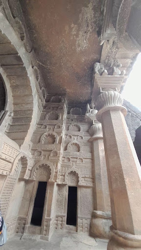 Cave 11, The vihara at Cave 11 has a rather unusual form, with a main chamber shaped somewhat like a chaitya, with a rectangular plan with a rounded apsidal far end, and a vaulted roof. Quite unique in its kind, having an arched roof and circular at the back like a Chaitya. The vihara has 11 cells, all with benches or beds. Their doors are surmounted by Chaitya-arches. The entrance to the cave is now through a large opening.