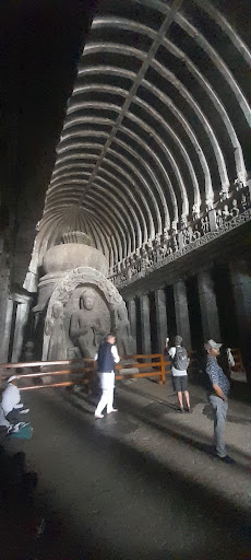 Read moreNotable among the Buddhist caves is Cave 10, a chaitya worship hall called the 'Vishvakarma cave' (literally the cave of one who accomplishes everything, or the architect of the gods), built around 650 CE.It is also known as the "Carpenter's Cave", because the rock has been given a finish that has the appearance of wooden beams. Beyond its multi-storeyed entry is a cathedral-like stupa hall also known as chaitya-griha (prayer house). At the heart of this cave is a 15-foot statue of Buddha seated in a preaching pose.
