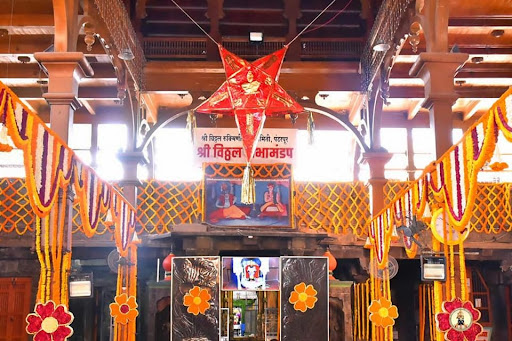 The temple includes a deeply atmospheric quadrangular wooden hall with deepmalas (lamp towers), the Sola Khambi hall with 16 pillars, shrines to Rukmini, and other deities like Ganapati, Krishna, Rama, Vishwanath, and Dattatreya. Many structural elements feature Deccan-style domes and arches.